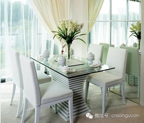 餐桌下部的层叠感显得生动而节奏感强烈,桌面则采用一方透明玻璃,简单的造型和材质,更显清新自然。
